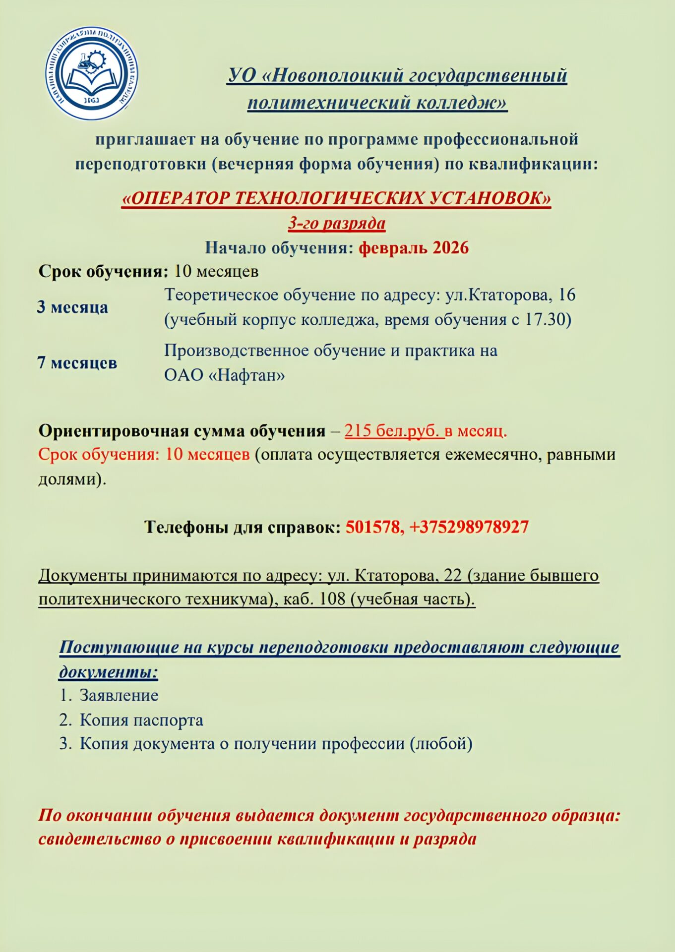 Свидетельство о присвоении квалификации и разрядаул. Ктаторова, 16 (учебный корпус колледжа)