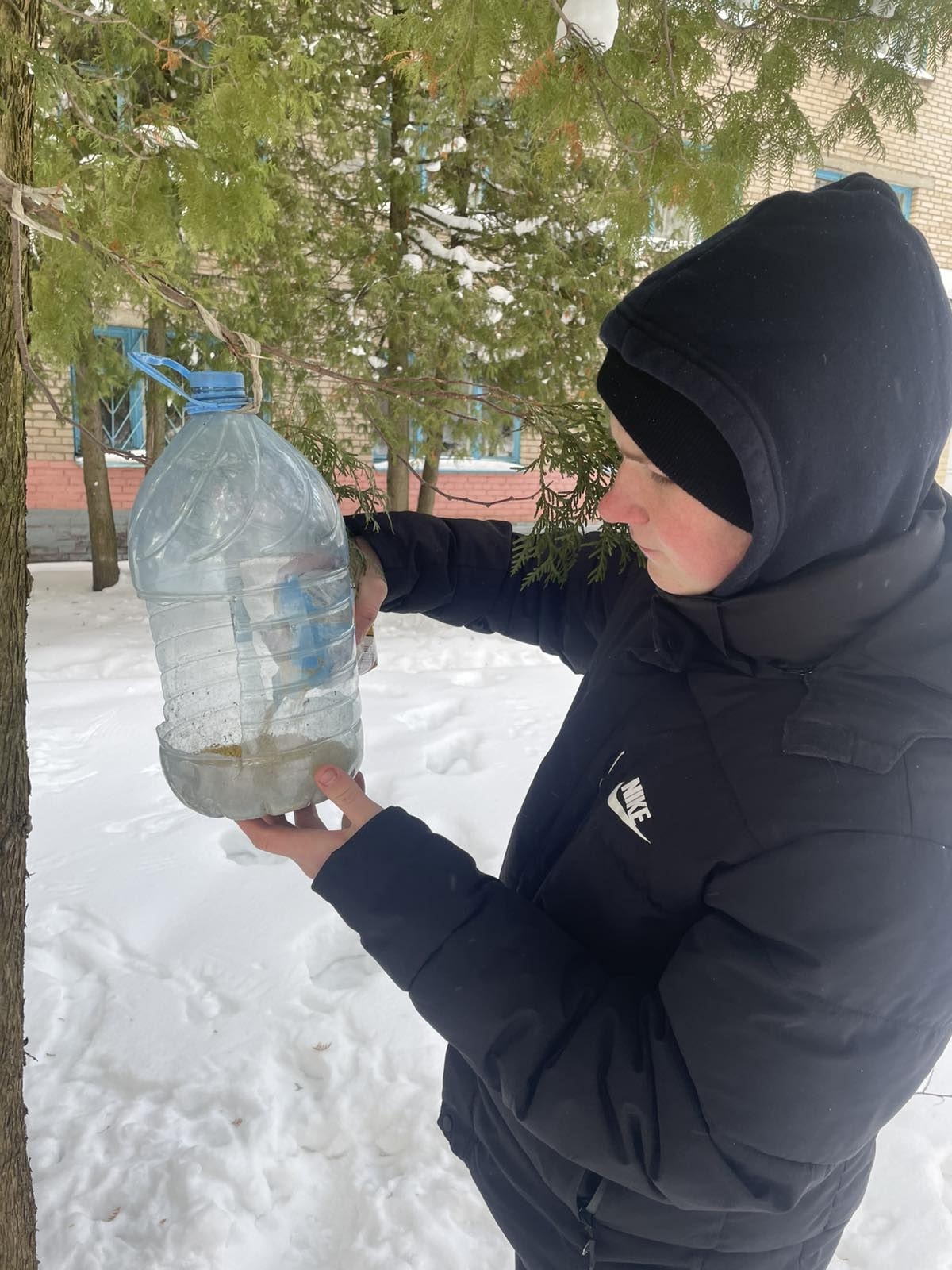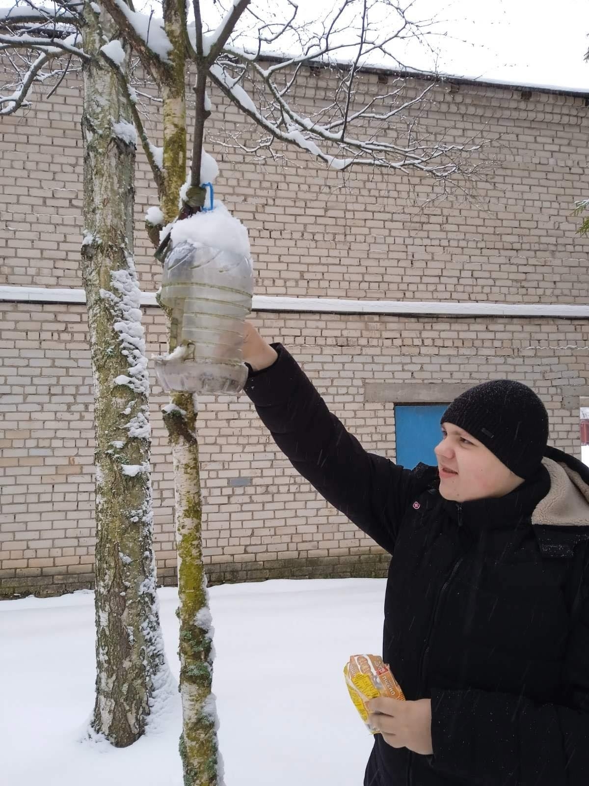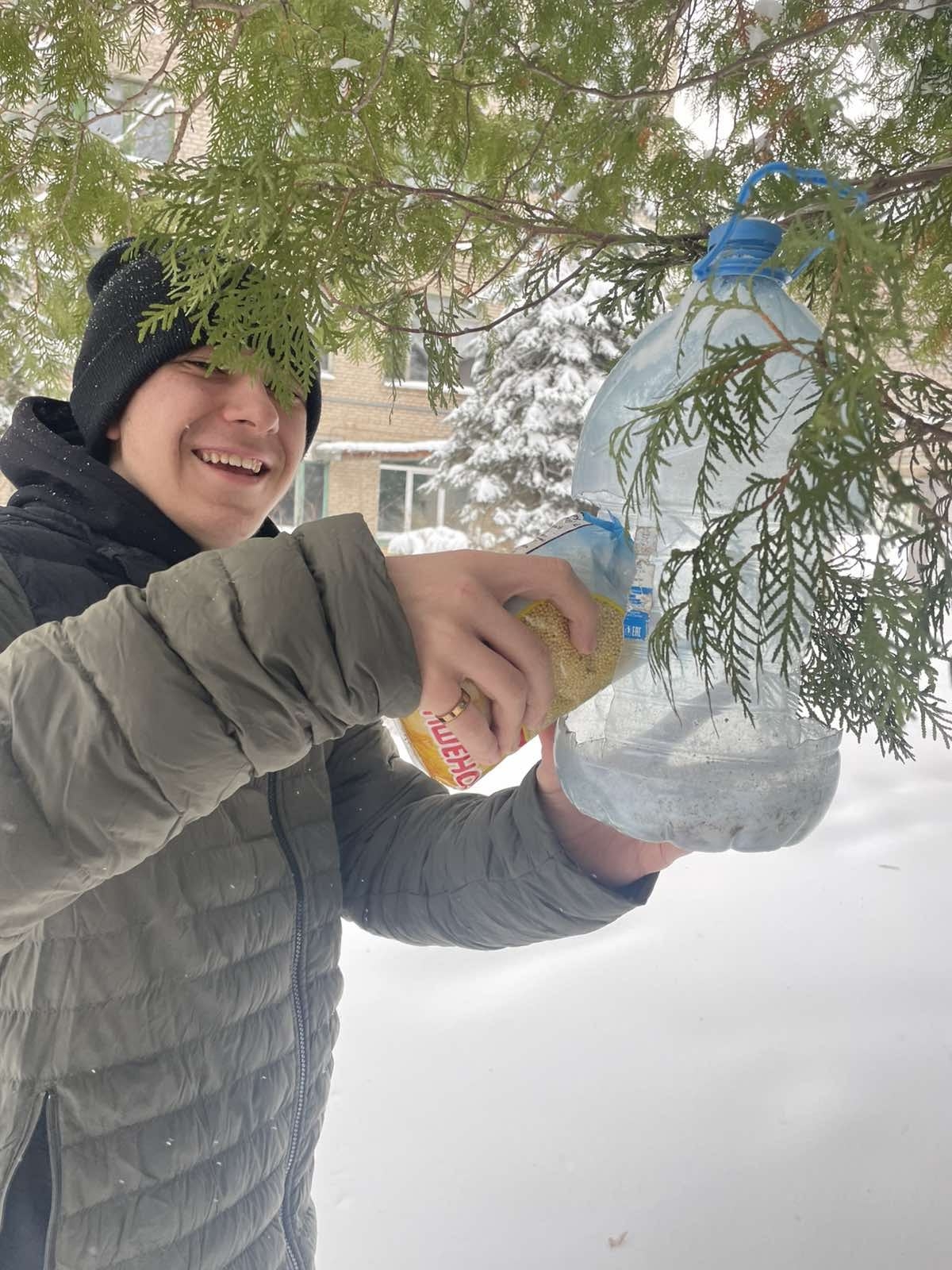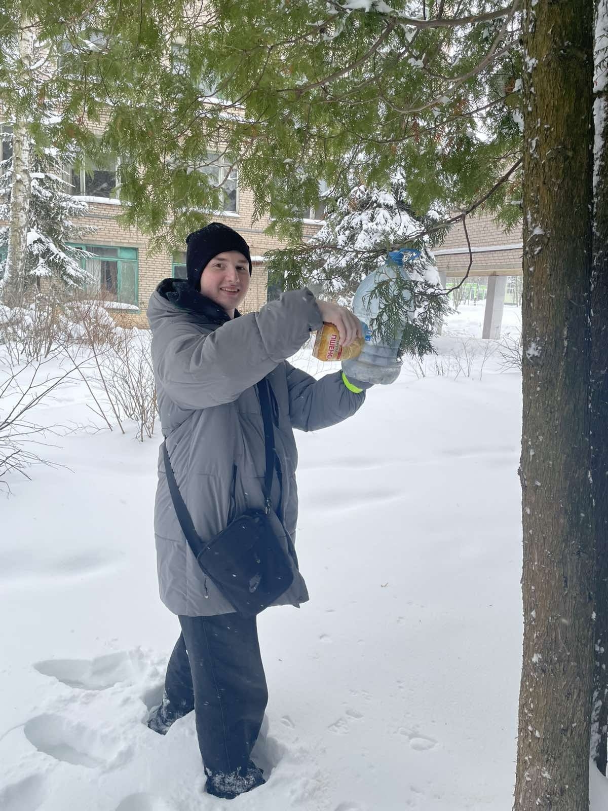 ❄️❄️❄️В морозные зимние дни волонтёры колледжа на постоянной основе проводили акции🐦🦆 «Покормим птиц зимой». 👬👬Ребята подсыпали пшено🥣 в изготовленные из бутылок кормушки, находящиеся на территории колледжа и общежития.