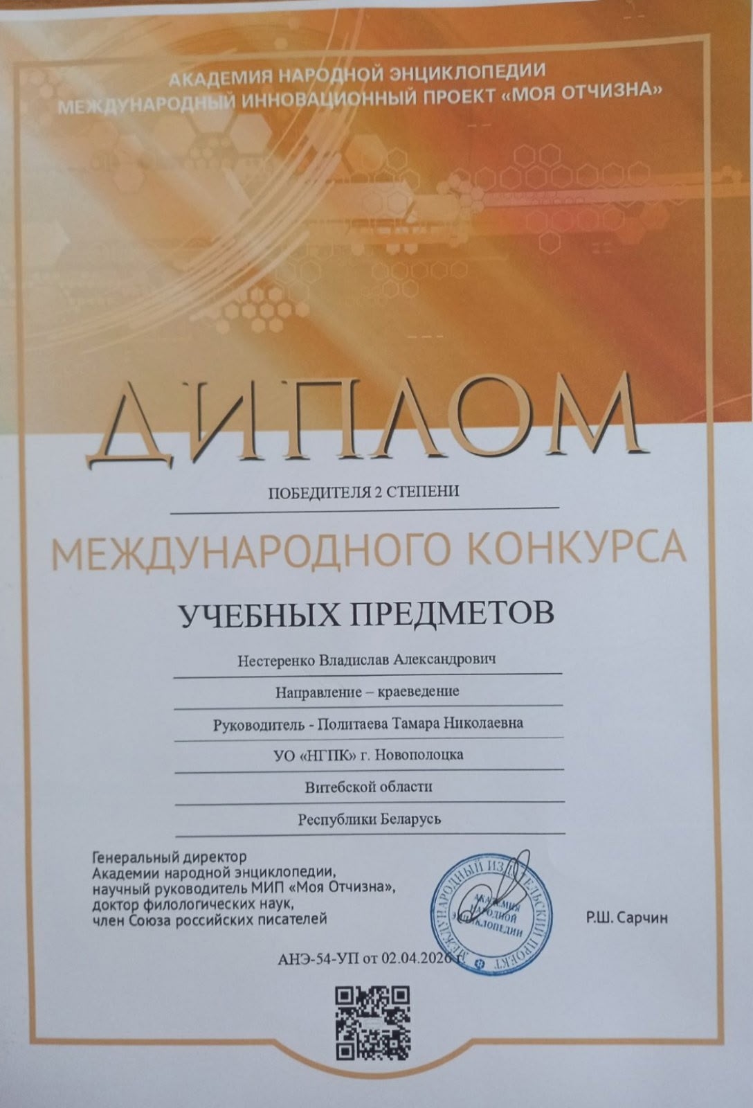 Π’ Π°ΠΏΡ€Π΅Π»Π΅ 2026 Π³ΠΎΠ΄Π° учащийся Π³Ρ€ΡƒΠΏΠΏΡ‹ 23-9 НСстСрСнко Владислав АлСксандрович принял участиС Π² прСстиТном