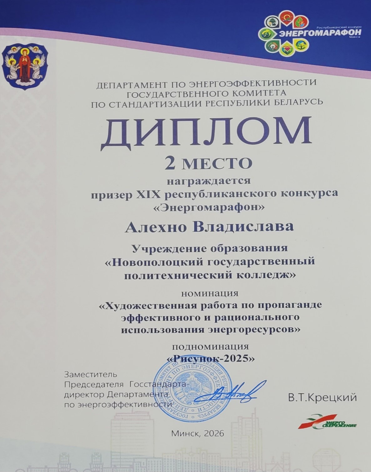 π Π‘ΡΠ΅Π΄ΠΈ ΠΏΠΎΠ±Π΅Π΄ΠΈΡΠ΅Π»Π΅ΠΉ β ΠΠ»Π΅Ρ Π½ΠΎ ΠΠ»Π°Π΄ΠΈΡΠ»Π°Π²Π°, ΡΡΠ°ΡΠ°ΡΡΡ Π½Π°ΡΠ΅Π³ΠΎ ΠΊΠΎΠ»Π»Π΅Π΄ΠΆΠ°, Π·Π°Π½ΡΠ²ΡΠ°Ρ Π²ΡΠΎΡΠΎΠ΅ ΠΌΠ΅ΡΡΠΎ Π² Π½ΠΎΠΌΠΈΠ½Π°ΡΠΈΠΈ Β«Π₯ΡΠ΄ΠΎΠΆΠ΅ΡΡΠ²Π΅Π½Π½Π°Ρ ΡΠ°Π±ΠΎΡΠ° ΠΏΠΎ ΠΏΡΠΎΠΏΠ°Π³Π°Π½Π΄Π΅ ΡΡΡΠ΅ΠΊΡΠΈΠ²Π½ΠΎΠ³ΠΎ ΠΈ ΡΠ°ΡΠΈΠΎΠ½Π°Π»ΡΠ½ΠΎΠ³ΠΎ ΠΈΡΠΏΠΎΠ»ΡΠ·ΠΎΠ²Π°Π½ΠΈΡ ΡΠ½Π΅ΡΠ³ΠΎΡΠ΅ΡΡΡΡΠΎΠ²Β» (ΠΏΠΎΠ΄Π½ΠΎΠΌΠΈΠ½Π°ΡΠΈΡ Β«Π ΠΈΡΡΠ½ΠΎΠΊ-2025Β»).
