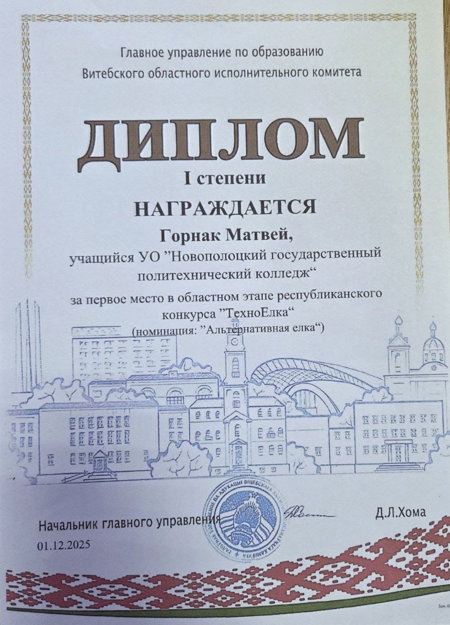🥇 Диплом I степени в номинации «Альтернативная ёлка»: Горнак Матвей (группа 25-7), работа «Ёлка для ангелов». Руководители: Максимчук С.В., мастер производственного обучения, и Максимчук К.Л., куратор.