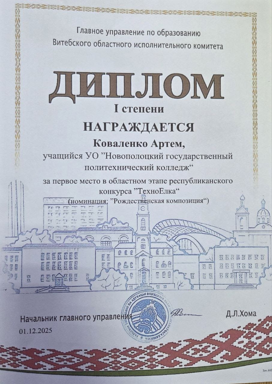 🥇 Диплом I степени в номинации «Рождественская композиция»: Коваленко Артём (группа 25-1), композиция «Рождественская сказка». Руководители: Василив О.М., мастер производственного обучения, и Антоненкова И.П., куратор.
