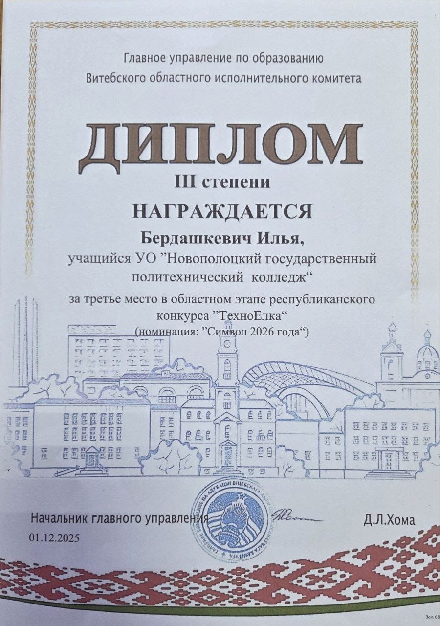 🥉 Диплом III степени в номинации «Символ 2026 года»: Бердашкевич Илья (группа 23-7), работа «В ожидании Нового года». Руководитель: Иванова С.Г., куратор.