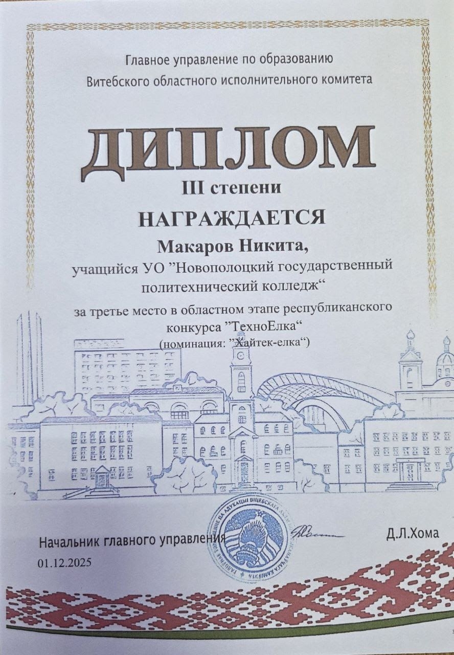 🥉 Диплом III степени в номинации «Хайтек-ёлка»: Макаров Никита (группа 23-9), работа «Стальная красавица». Руководители: Зимакова В.А., мастер производственного обучения, и Политаева Т.Н., куратор.