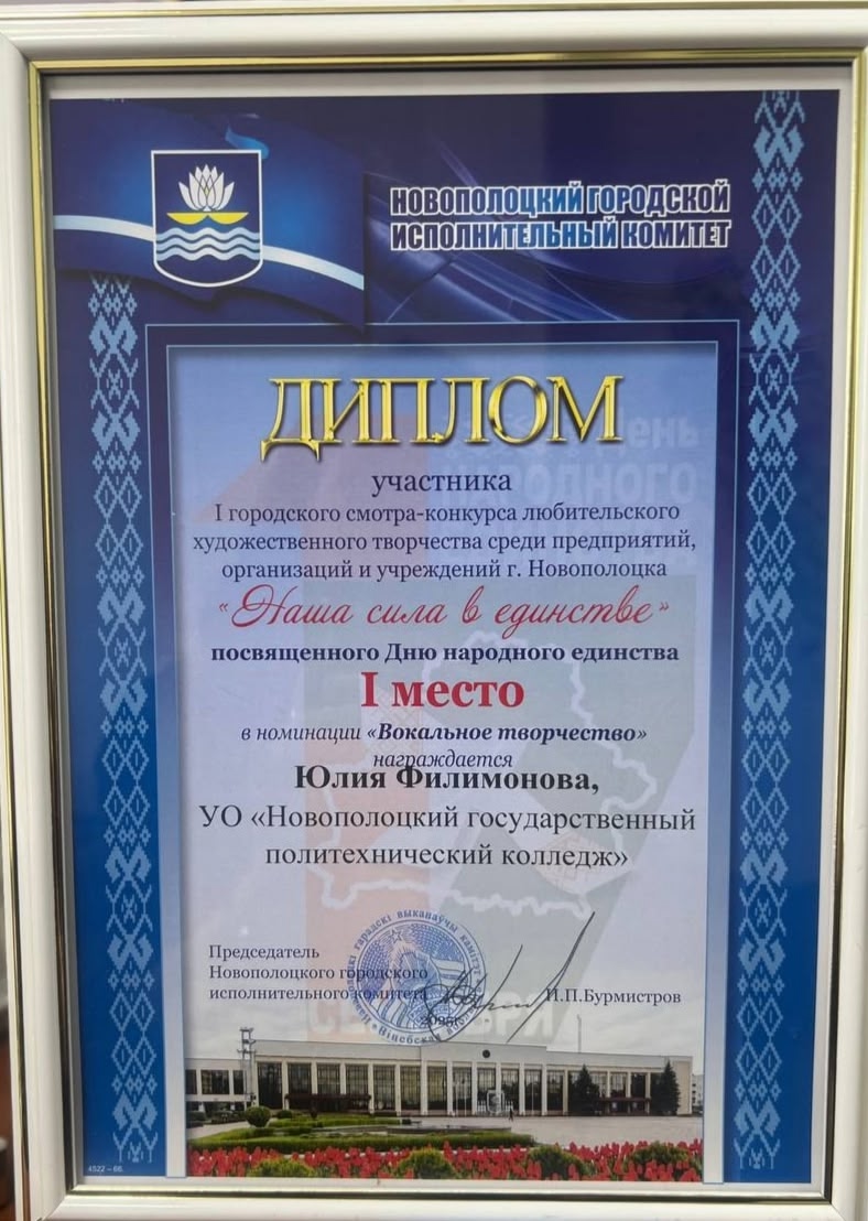 Поздравляем педагога дополнительного образования Филимонову Юлию Григорьевну, занявшую 🥇 1 место🏆 в 1 городском смотре-конкурсе любительского художественного творчества среди предприятий, организаций и учреждений г. Новополоцка!👍💯