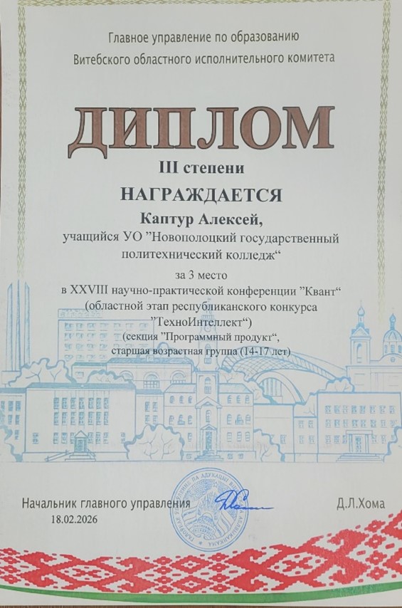 Π£ΡΠ°ΡΠΈΠΉΡΡ Π½Π°ΡΠ΅Π³ΠΎ ΠΊΠΎΠ»Π»Π΅Π΄ΠΆΠ° ΠΠ°ΠΏΡΡΡ ΠΠ»Π΅ΠΊΡΠ΅ΠΉ (Π³ΡΡΠΏΠΏΠ° 25-9) ΠΏΡΠΈΠ½ΡΠ» ΡΡΠ°ΡΡΠΈΠ΅ Π² ΡΠ΅ΠΊΡΠΈΠΈ Β«ΠΡΠΎΠ³ΡΠ°ΠΌΠΌΠ½ΡΠΉ ΠΏΡΠΎΠ΄ΡΠΊΡΒ» ΠΈ Π·Π°Π½ΡΠ» III ΠΌΠ΅ΡΡΠΎ, Π½Π°Π³ΡΠ°ΠΆΠ΄ΡΠ½ Π΄ΠΈΠΏΠ»ΠΎΠΌΠΎΠΌ III ΡΡΠ΅ΠΏΠ΅Π½ΠΈ.
